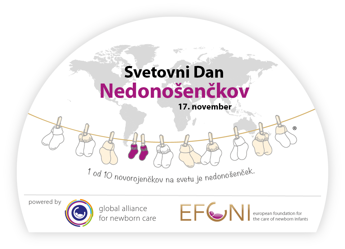 Svetovni dan prezgodaj rojenih otrok – 17. november je dan v letu, ki je od leta 2008 posvečen globalnemu ozaveščanju o izivih in bremenu prezgodnjega rojstva. Pobudo za ta dan so najprej dale evropske organizacije staršev, združene v Evropsko fondacijo za skrb za novorojenčke (European Foundation for the Care of Newborn Infants, EFCNI), katere član je tudi naše Društvo za pomoč prezgodaj rojenim otrokom. Pridružili so se jim še ameriško (March od Dimes), vstralsko (National Premmie Foundation) in afriško (LittleBigSouls) združenje, kar je gibanje spremenilo v medcelinsko. Podprla sta jih tudi Svetovna zdravstvena organizacija (WHO) in UNICEF. V zadnjih letih na ta dan posamezniki in organizacije iz več kot 100 držav združimo moči z aktivnostmi in organizacijo posebnih dogodkov, ki naj opozorijo, da je po vsem svetu skoraj desetina otrok rojenih prezgodaj in da ti otroci in njihove družine zaslužijo pozornost ter pomoč. K udeležbi pri počastitvi svetovnega dne prezgodaj rojenih otrok so vabljeni vsi – ne le združenja staršev, zdravstveni delavci, bolnišnice, dobrodelne ustanove, temveč tudi podjetja, politiki, mediji. In tudi majhen napor ali pozornost pomeni veliko in lahko prinese pozitivne spremembe. Razpoznavni znak Svetovnega dneva nedonošenčkov so drobne vijoličaste nogavičke, obešene na vrvici skupaj z velikimi, belimi (“Socks for Life”) ter vijolična osvetlitev (ta barva ponazarja izjemnost in občutljivost najmanjših rojenih otrok). Slogan letošnjega svetovnega dne je “Together for babies born too soon – Caring for the